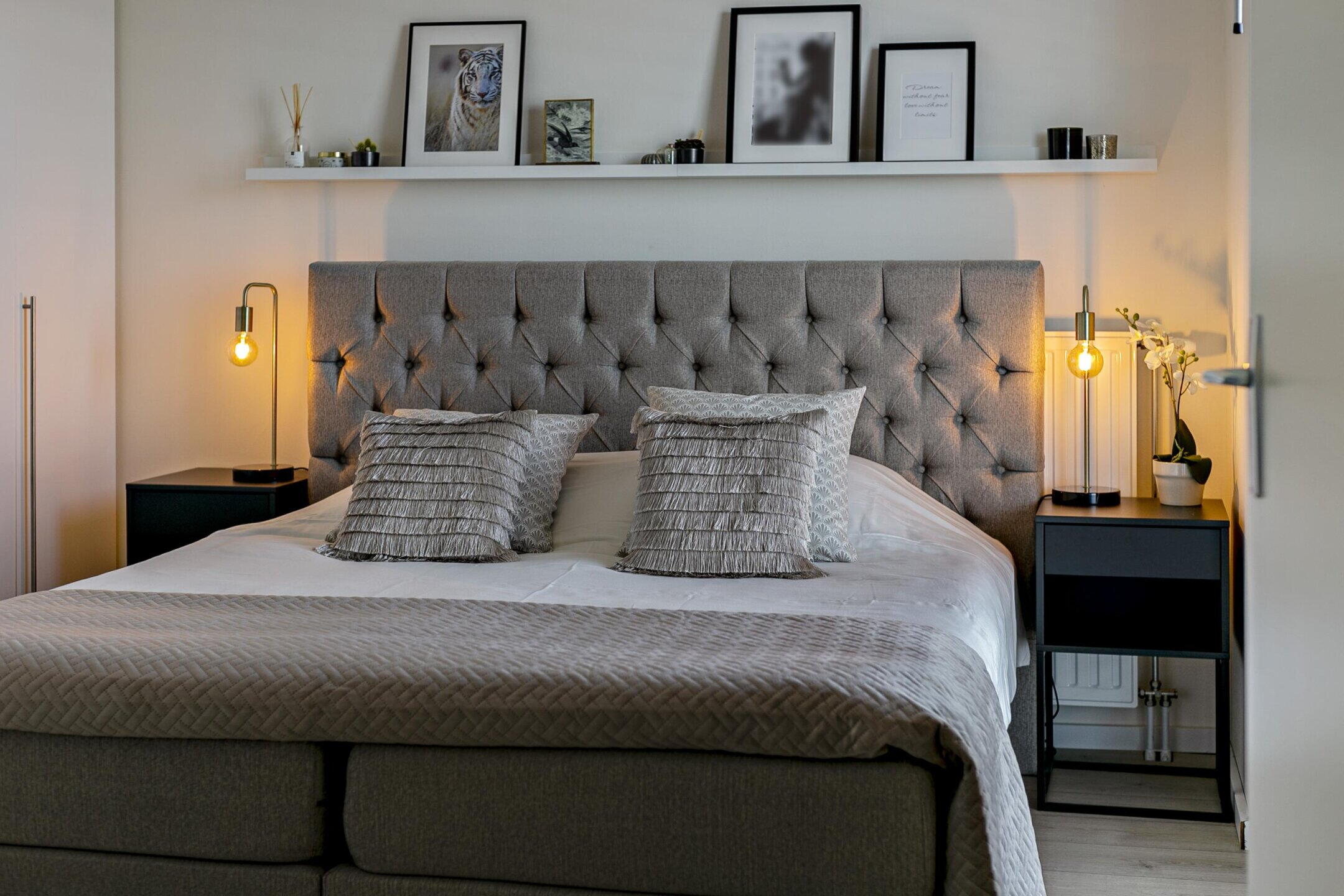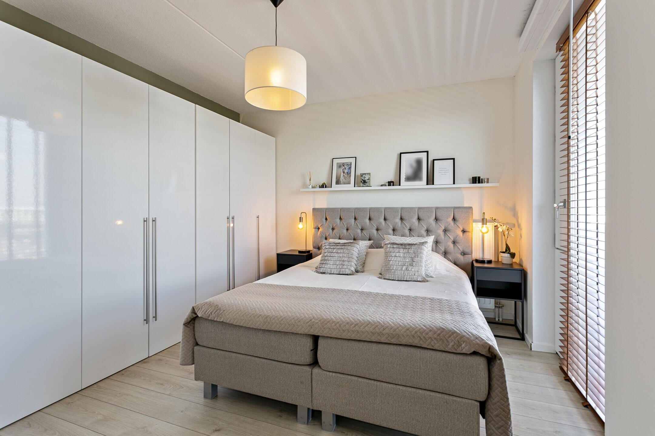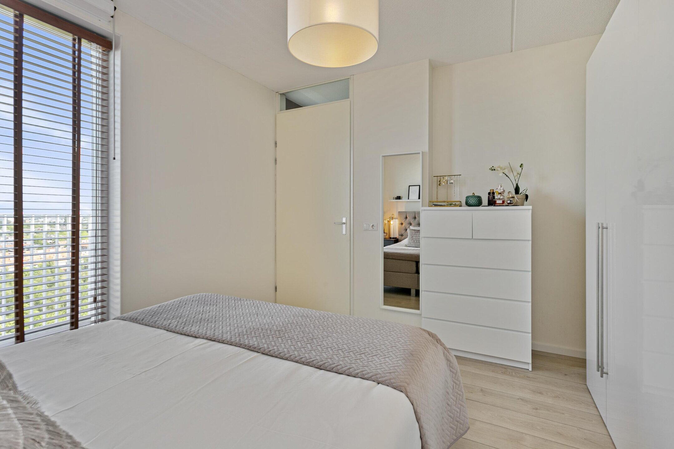 De ruime slaapkamer (ca. 3.95 / 3.75 x 3.52 m) is gelegen aan de galerijzijde en voorzien van een kamerhoge raampartij, een mooie laminaatvloer en strakke wand- en plafondafwerking.