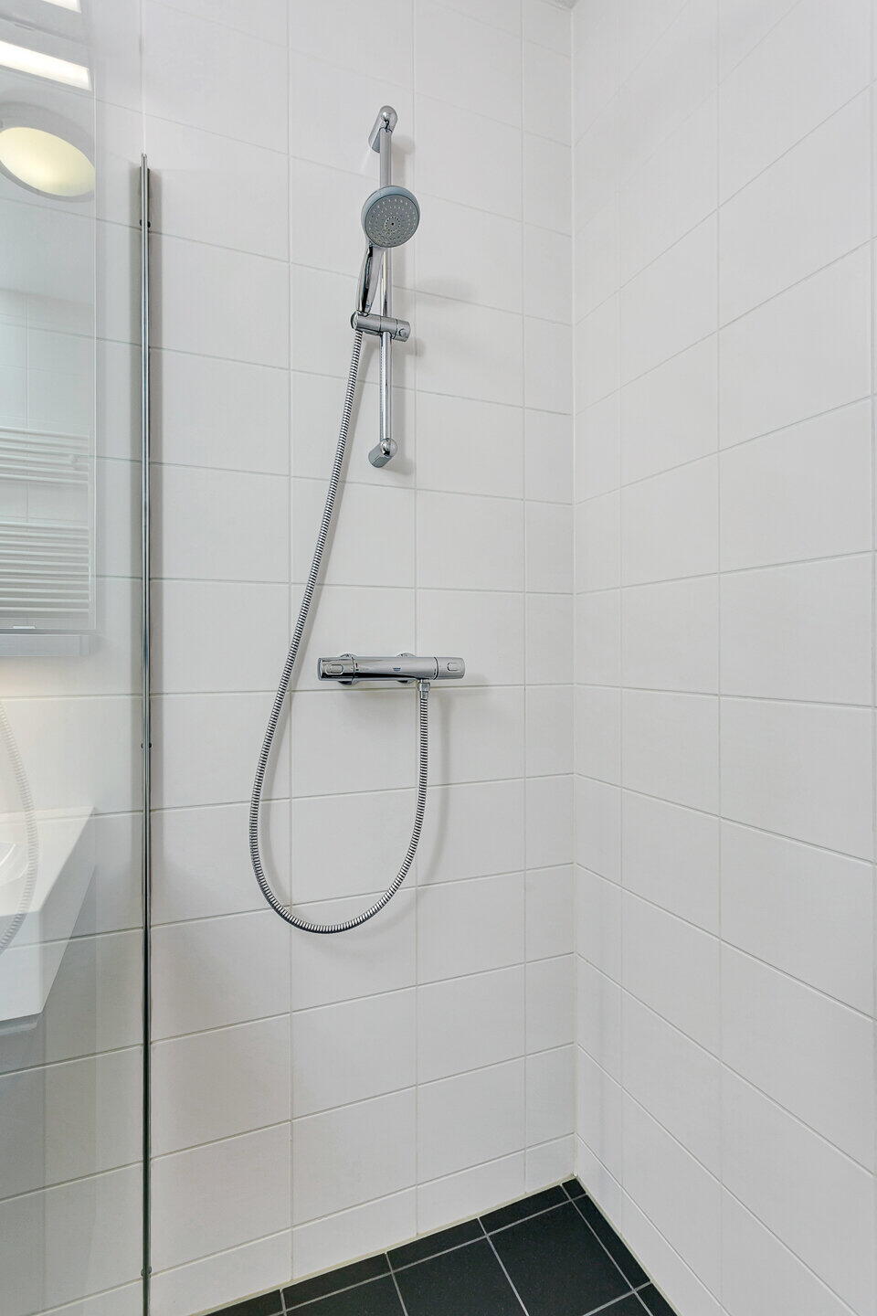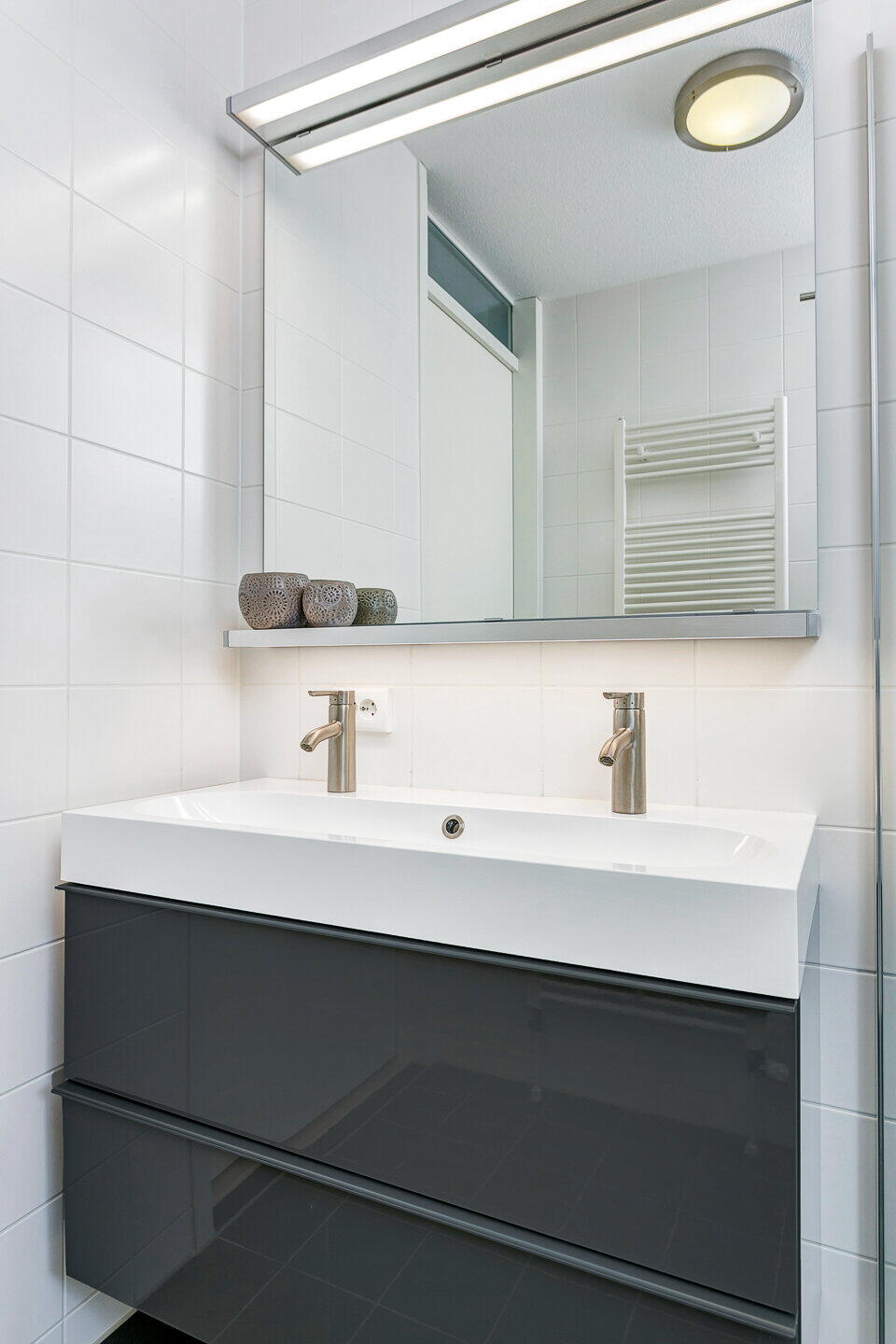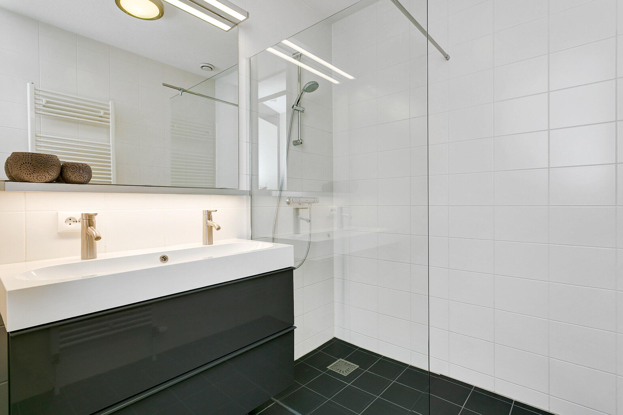 De geheel betegelde badkamer (ca. 2.05 x 1.85 m) is voorzien van een inloopdouche met glazen douchescherm, dubbele wastafel in meubel en een designradiator. De badkamer is afgewerkt met een moderne donkere vloertegel en lichte wandtegel en beschikt over mechanische afzuiging.
