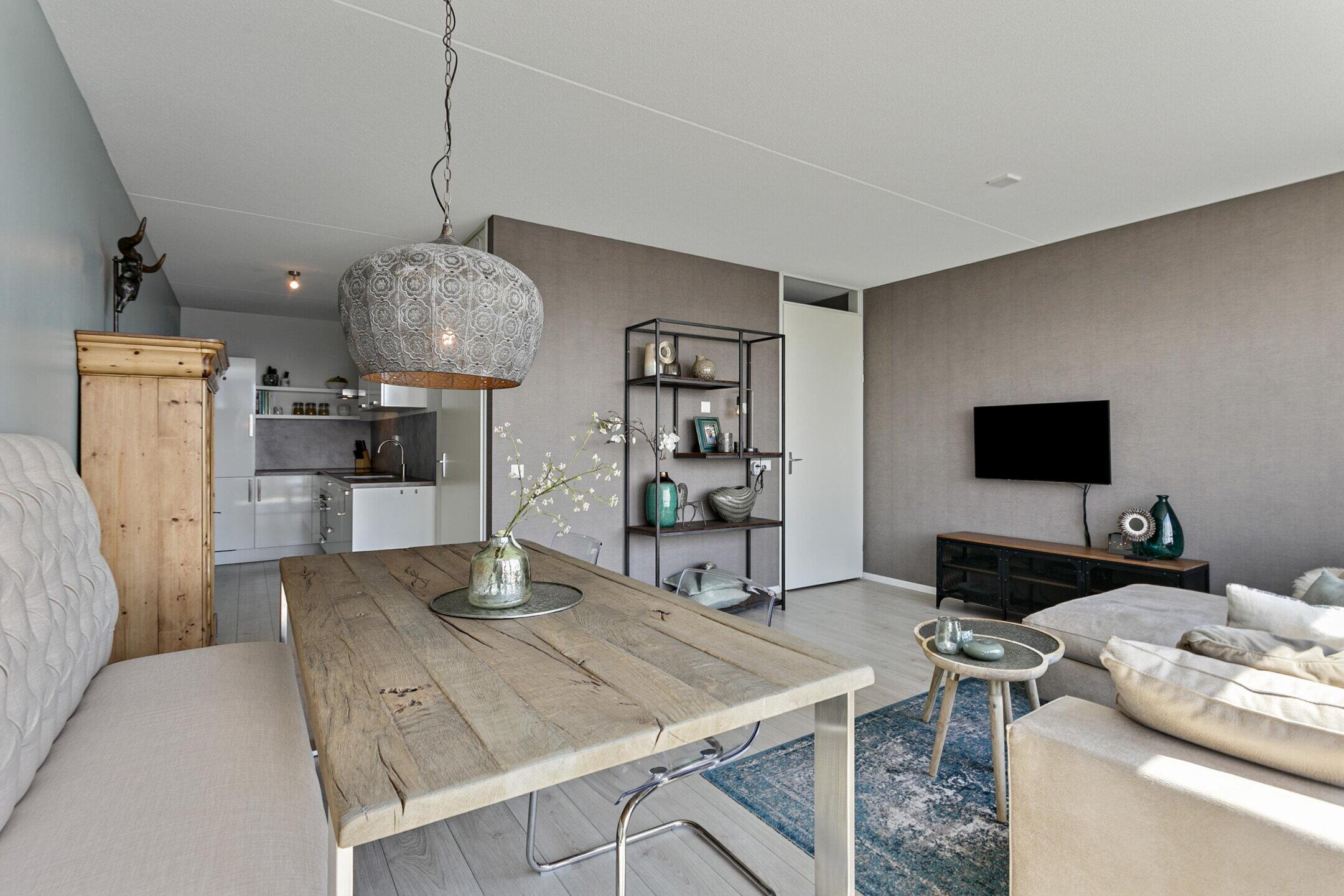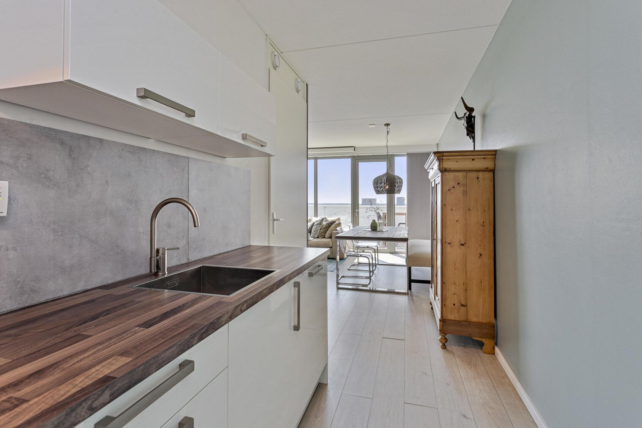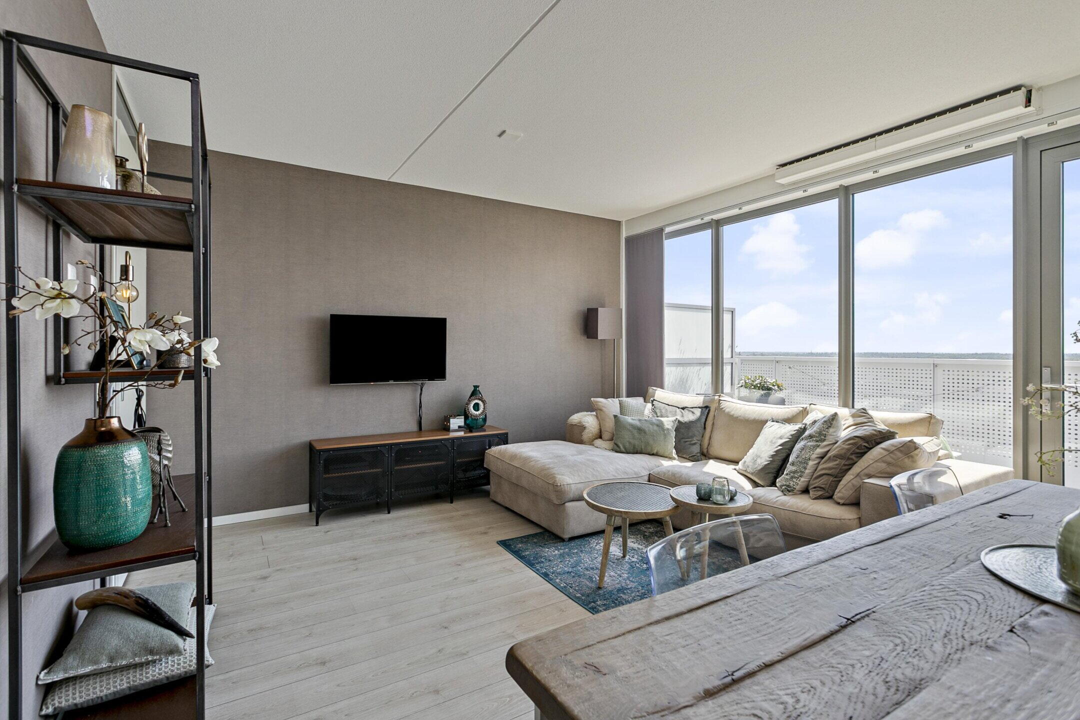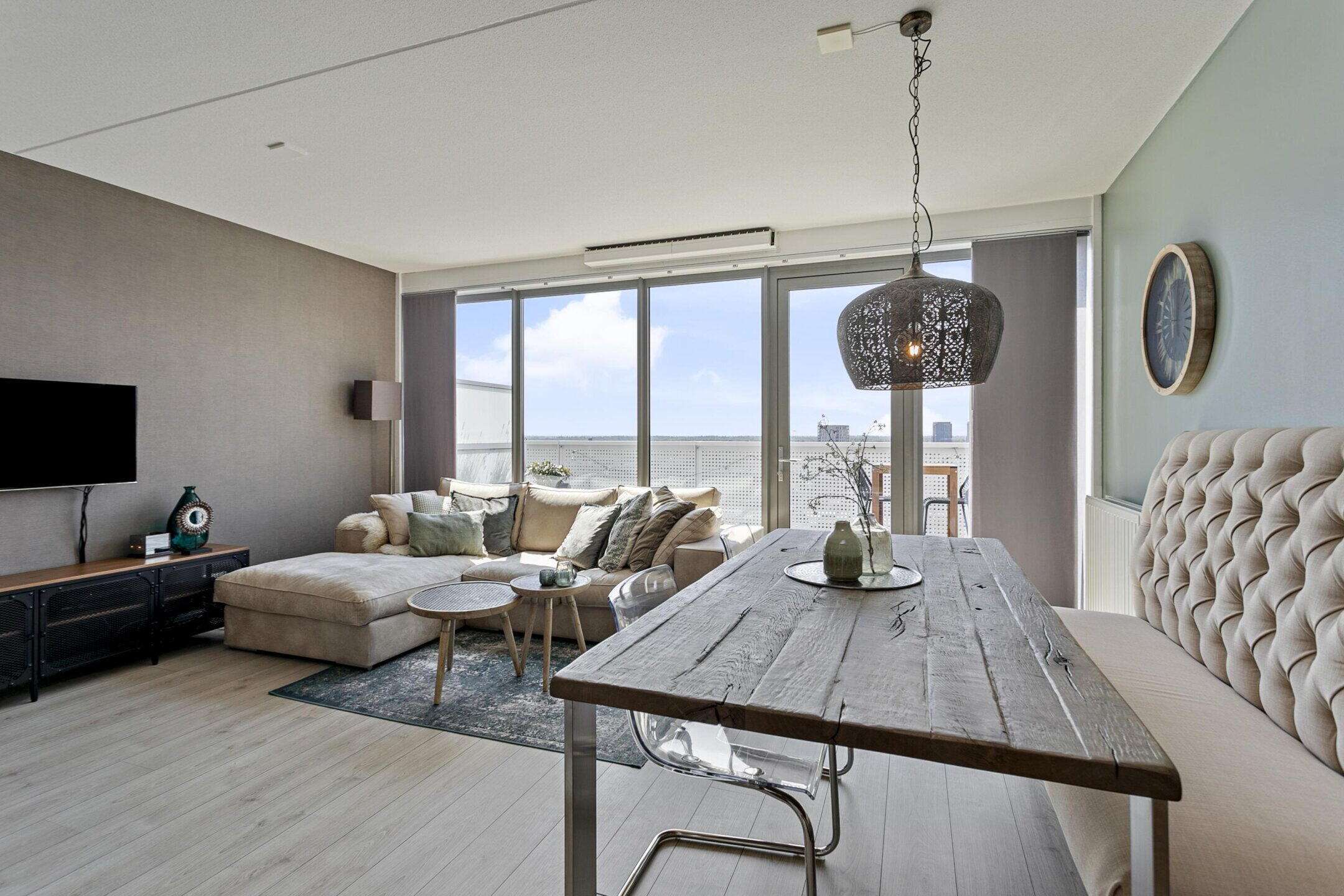 De woonkamer (ca. 5.15 x 4.25 m) is gesitueerd aan de achterzijde van het appartement en afgewerkt met een nette laminaatvloer. Dankzij de grote raampartijen op het zuiden kent de woonkamer een spectaculaire lichtinval gedurende de gehele dag. Deze lichtinval, gecombineerd met het panoramische uitzicht vanaf deze hoogte, maakt deze woonkamer een bijzonder prettige ruimte om in te verblijven.