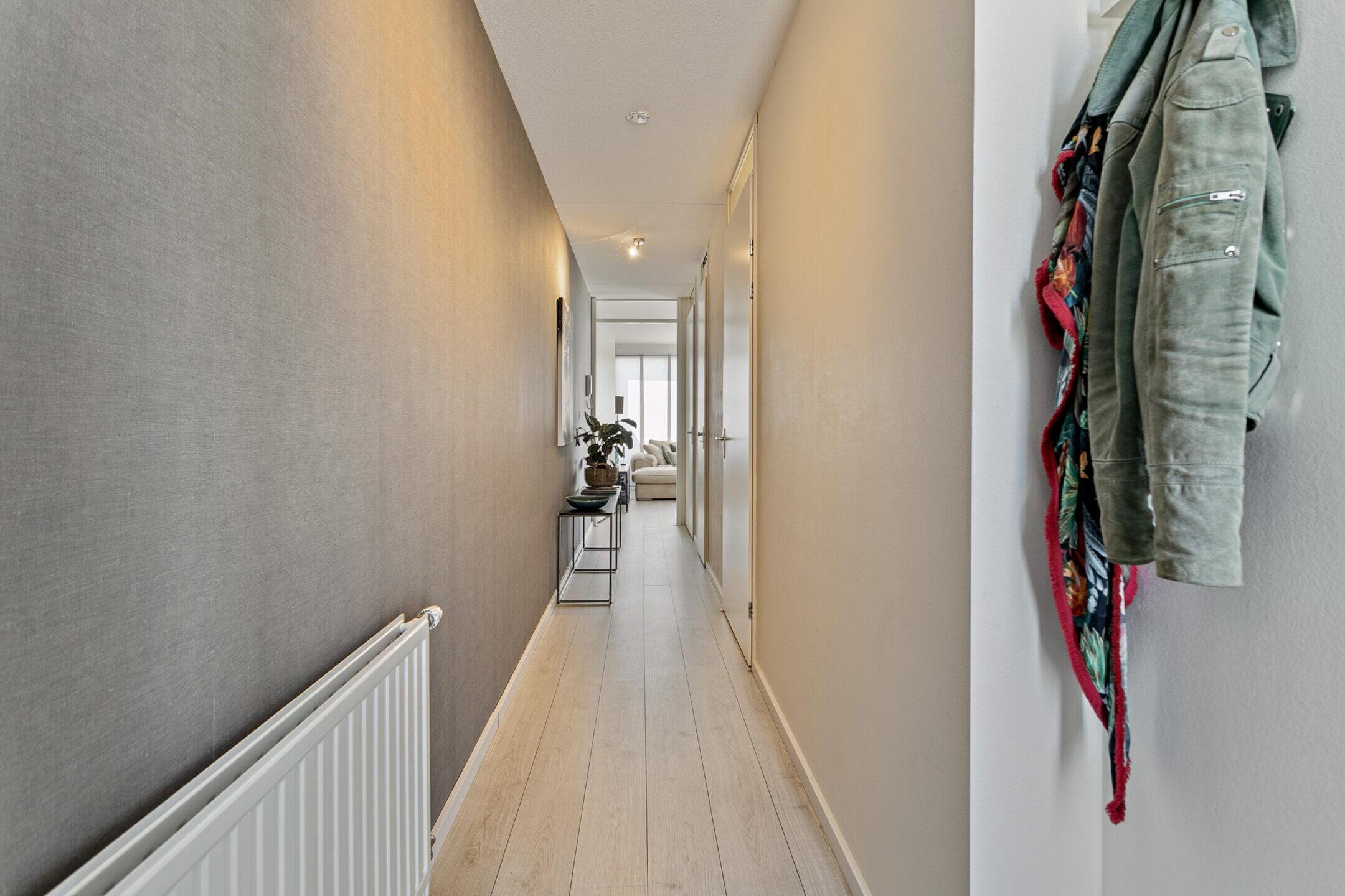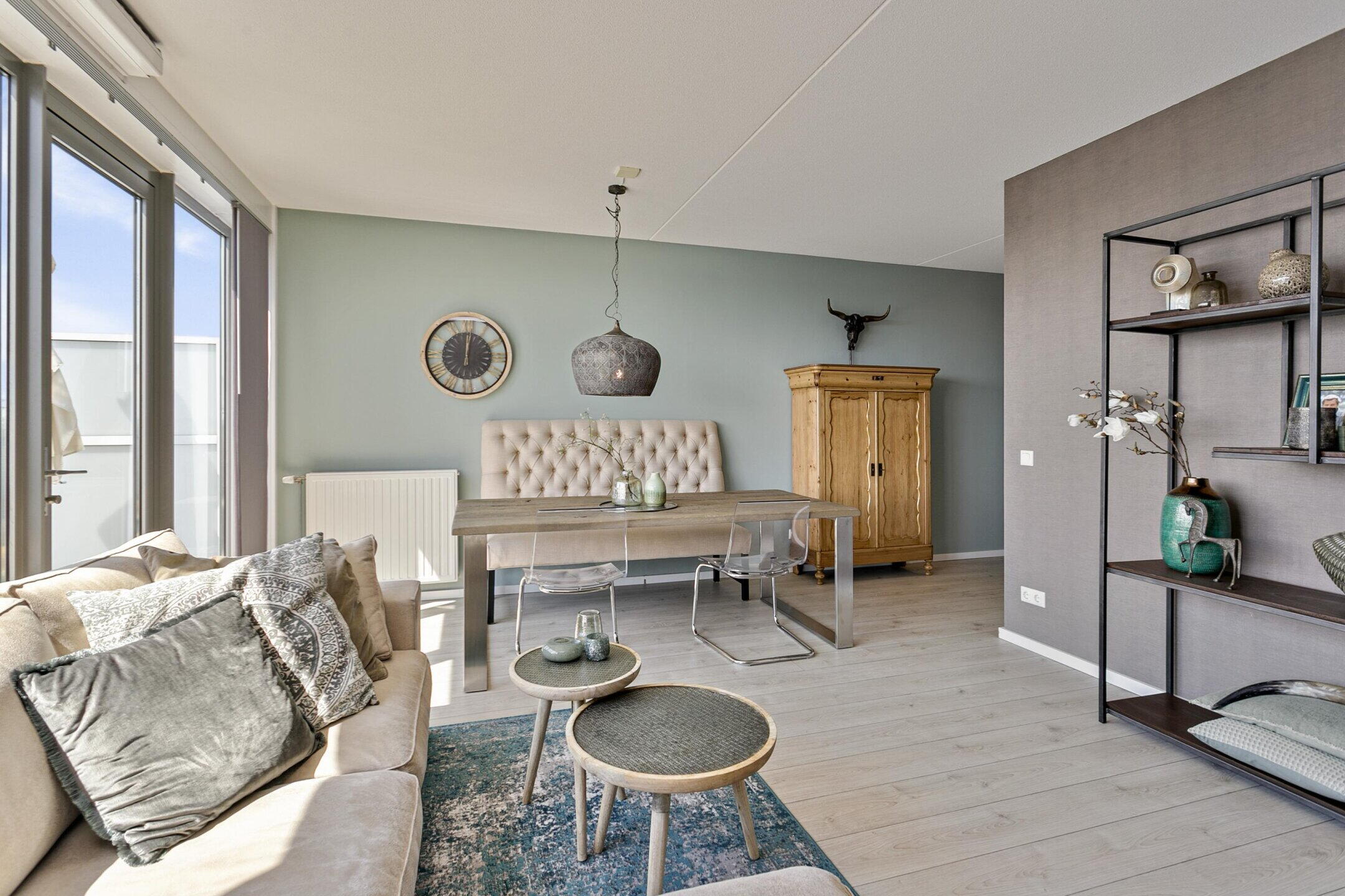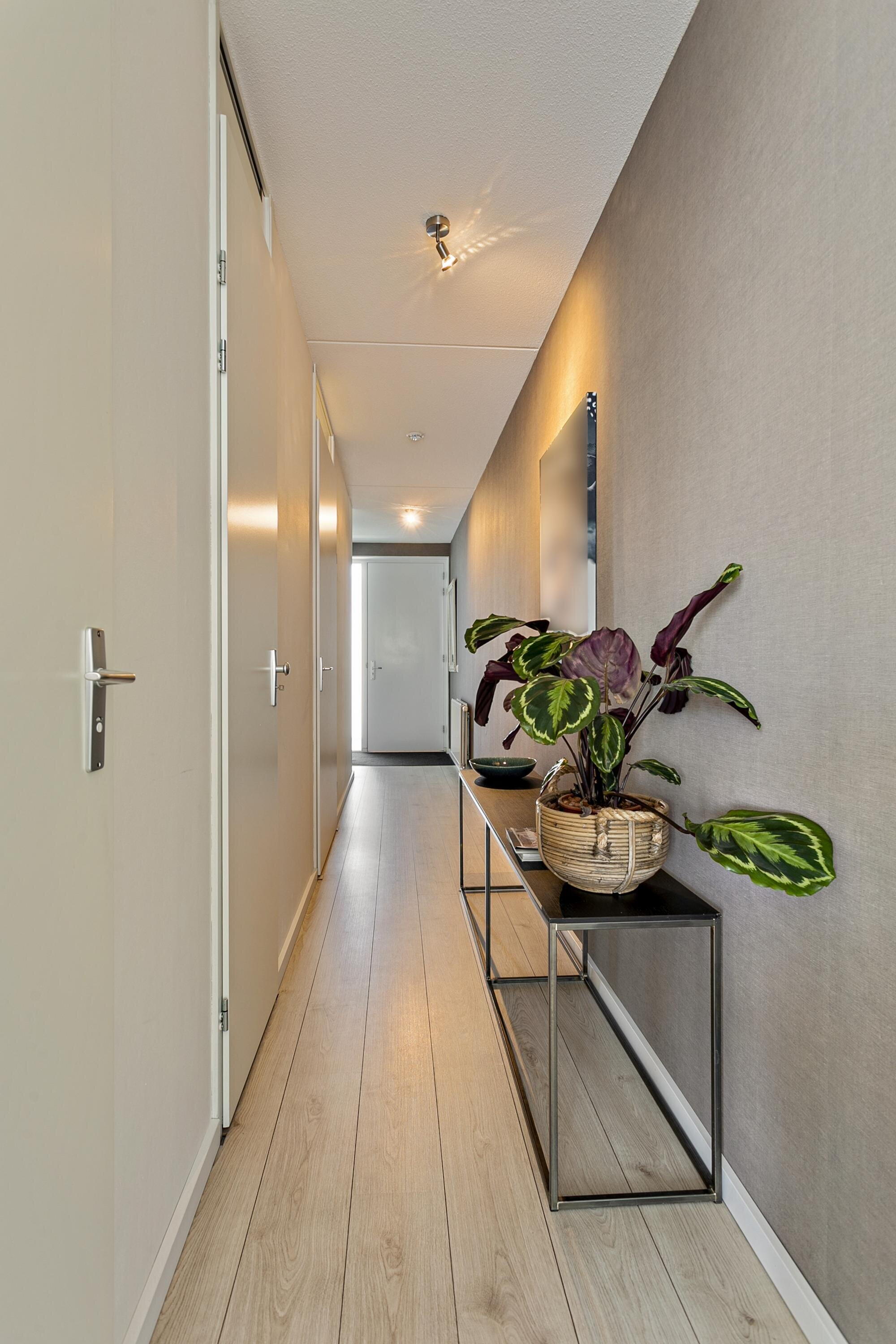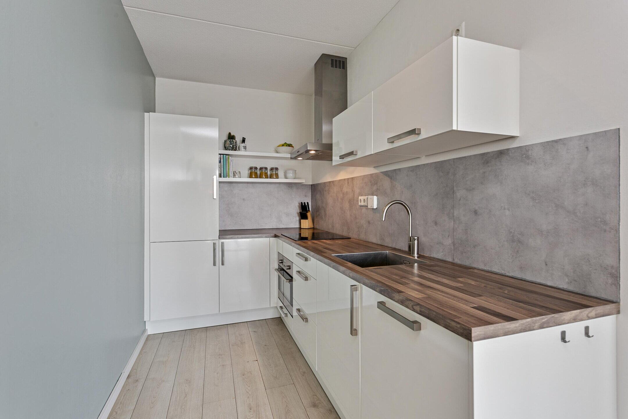 De woonkamer (ca. 5.15 x 4.25 m) is gesitueerd aan de achterzijde van het appartement en afgewerkt met een nette laminaatvloer. Dankzij de grote raampartijen op het zuiden kent de woonkamer een spectaculaire lichtinval gedurende de gehele dag. Deze lichtinval, gecombineerd met het panoramische uitzicht vanaf deze hoogte, maakt deze woonkamer een bijzonder prettige ruimte om in te verblijven.