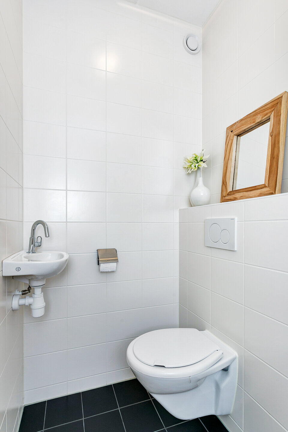 De toiletruimte is eveneens geheel betegeld en voorzien van een hangend closet met inbouwreservoir, fonteintje en mechanische afzuiging.