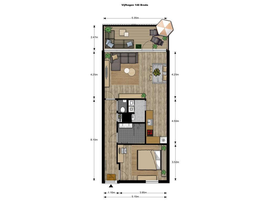 Vanuit de woonkamer is er middels een loopdeur toegang tot het royale balkon (ca. 5.35 x 2.47 m), gesitueerd op het zuiden. Hier geniet u de hele dag van de zon, optimale privacy en één van de meest indrukwekkende vergezichten van Breda en omgeving.